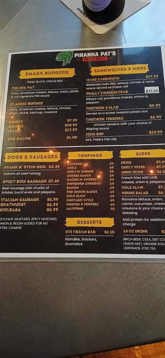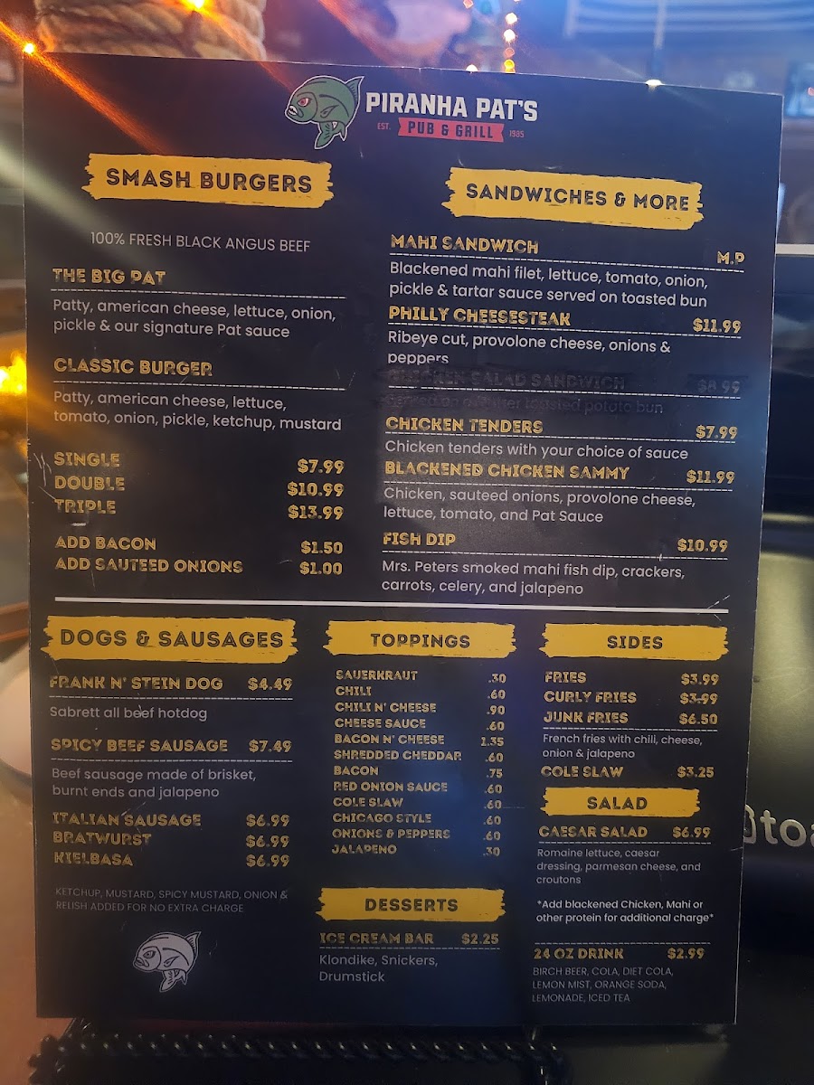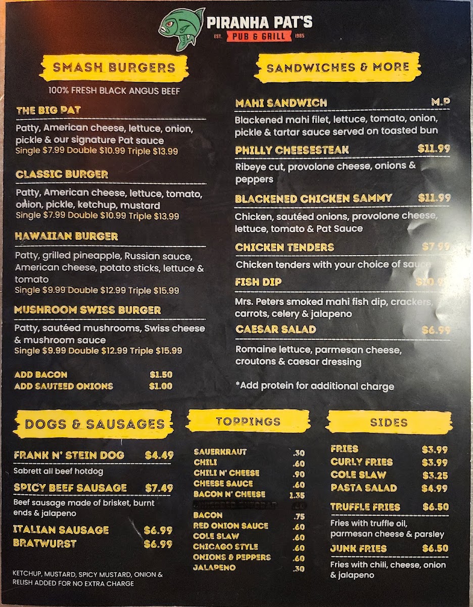 At Piranha Pat's Pub & Grill, you're in for a great time with a menu full of mouth-watering options. Located at 395 NW Dixie Hwy in Stuart, FL, this local favorite has something for everyone, whether you're in the mood for a juicy burger, fresh seafood, or a tasty appetizer to share with friends. The Piranha Pat's Pub & Grill Menu brings a mix of comfort food and bold flavors, all served in a cozy, laid-back atmosphere. You can dig into hearty plates, sip on a cold drink, and enjoy the perfect balance of flavors that keep you coming back for more. Whether it's a casual meal after work or a weekend get-together, there's always something to satisfy your cravings. So sit back, relax, and dive into the delicious variety Piranha Pat's has to offer!